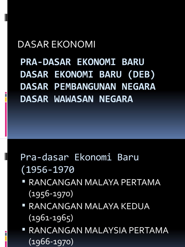 Dasar Ekonomi Baru Deb from imgv2-2-f.scribdassets.com Dasar ekonomi baru, selangor : Makanya perkara 4.a dan 4.b diutamakan antara matlamat dasar ekonomi baru (deb) supaya tidak berulang lagi sejarah hitam dibumi bertuah ini. Dasar ekonomi baru (deb) yang meliputi tempoh 1971 hingga 1990 telah tamat. Dasar ekonomi baru matlamat utama dasar ekonomi baru (deb) ialah untuk memajukan ekonomi serta menghapuskan pengenalan ekonomi berasaskan etnik yang menjadi asas kepada penyusunan semula sosioekonomi negara. Deb merupakan dasar yang diperkenalkan oleh abdul razak, perdana menteri malaysia kedua pada tahun 1970 selepas tragedi 13 mei 1969. Secara keseluruhannya kadar kemiskinan di seluruh malaysia telah berjaya dikurangkan. Dasar ekonomi baru (deb) merupakan satu bentuk perancangan yang dilancarkan oleh kerajaan dalam tahun 1970 melalui rancangan malaysia kedua. Terutama adalah untuk merapatkan jurang ekonomi baru dan.