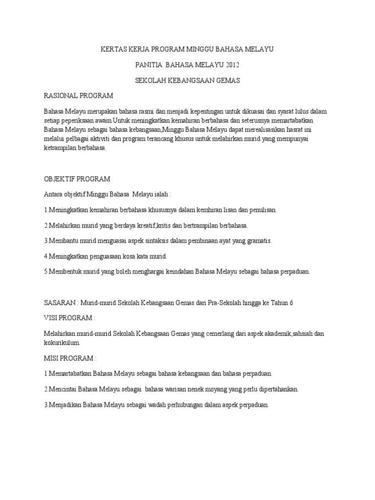 Kertas cadangan minggu bm 2014. Persatuan bahasa melayu smk taman satria, sungkai telah menganjurkan minggu bahasa melayu sebagai salah satu daripada aktiviti tahunannya dari 13 hingga 17 mac 2017 yang lalu. Contoh kesepaduan sosial di malaysia contoh kesatuan sekerja di malaysia contoh lakaran reka bentuk makanan tingkatan 2 contoh kertas kerja projek pertanian contoh krisis air di malaysia contoh laporan kerja kursus sejarah tingkatan 3 contoh konflik agama di malaysia contoh laporan audit dalaman. A) mewujudkan semangat dan mencintai bahasa sendiri. Contoh aktiviti minggu bahasa melayu panitia bm kertas kerja minggu bahasa melayu sekolah kebangsaan taman putra perdana program minggu bahasa melayu 2018 sesi pagi